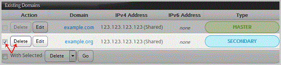 4. Under "Existing Domains " tab, Select Appropriate domain name you want to delete.