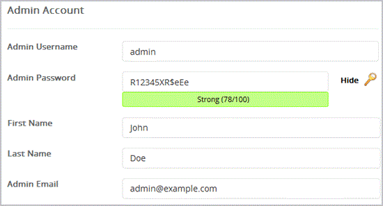 8. Under the "Admin Account" field enter the following information: