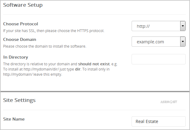 • In Directory: If you want to install this in a directory, for example example.com/directory, enter the directory name. Otherwise, leave this blank to install in your main domain example.com