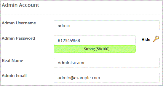 8. Under the "Admin Account" field enter the following information: