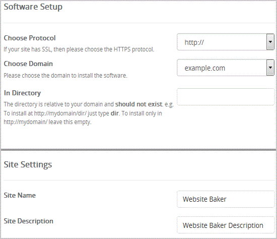 - In Directory: If you want to install this in a directory, for example example.com/directory, enter the directory name. Otherwise, leave this blank to install in your main domain example.com