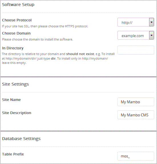 • In Directory: If you want to install this in a directory, for example example.com/directory, enter the directory name. Otherwise, leave this blank to install in your main domain example.com